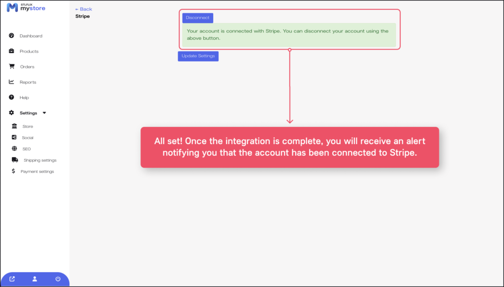 5. Done! You will receive an alert that your Stripe integration settings have been completed and are now active.