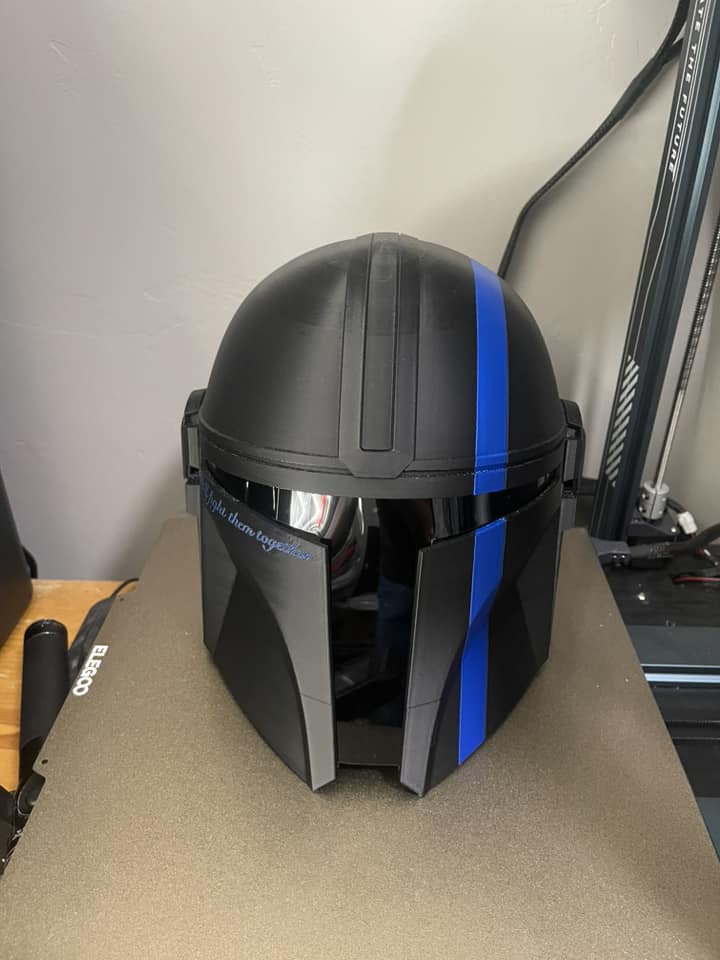 3D printed Mandalorian helmet featuring a thin blue line. This particular helmet came has the custom text “We’ll fight them together” on the the side. This can be taken off, or other custom text can be addded. This helmet is sized approximately the same as a medium to large motorcycle helmet. It includes a tinted visor.