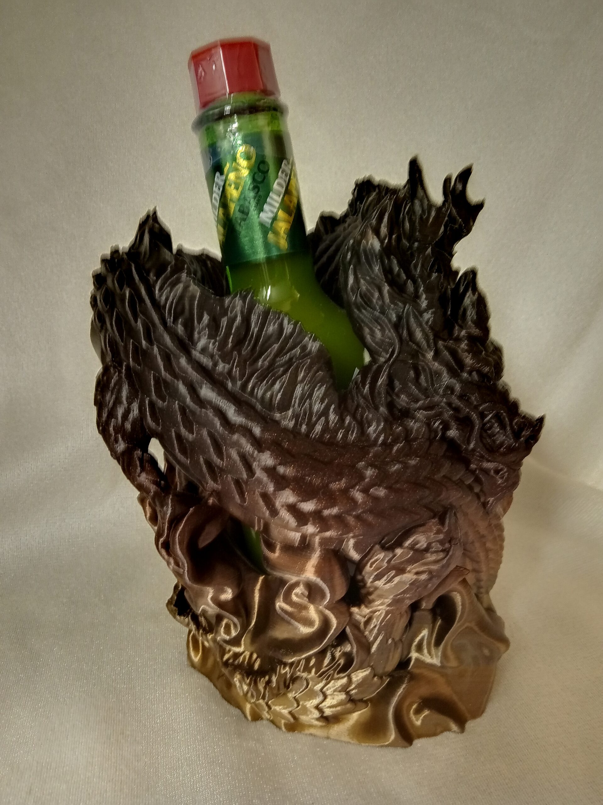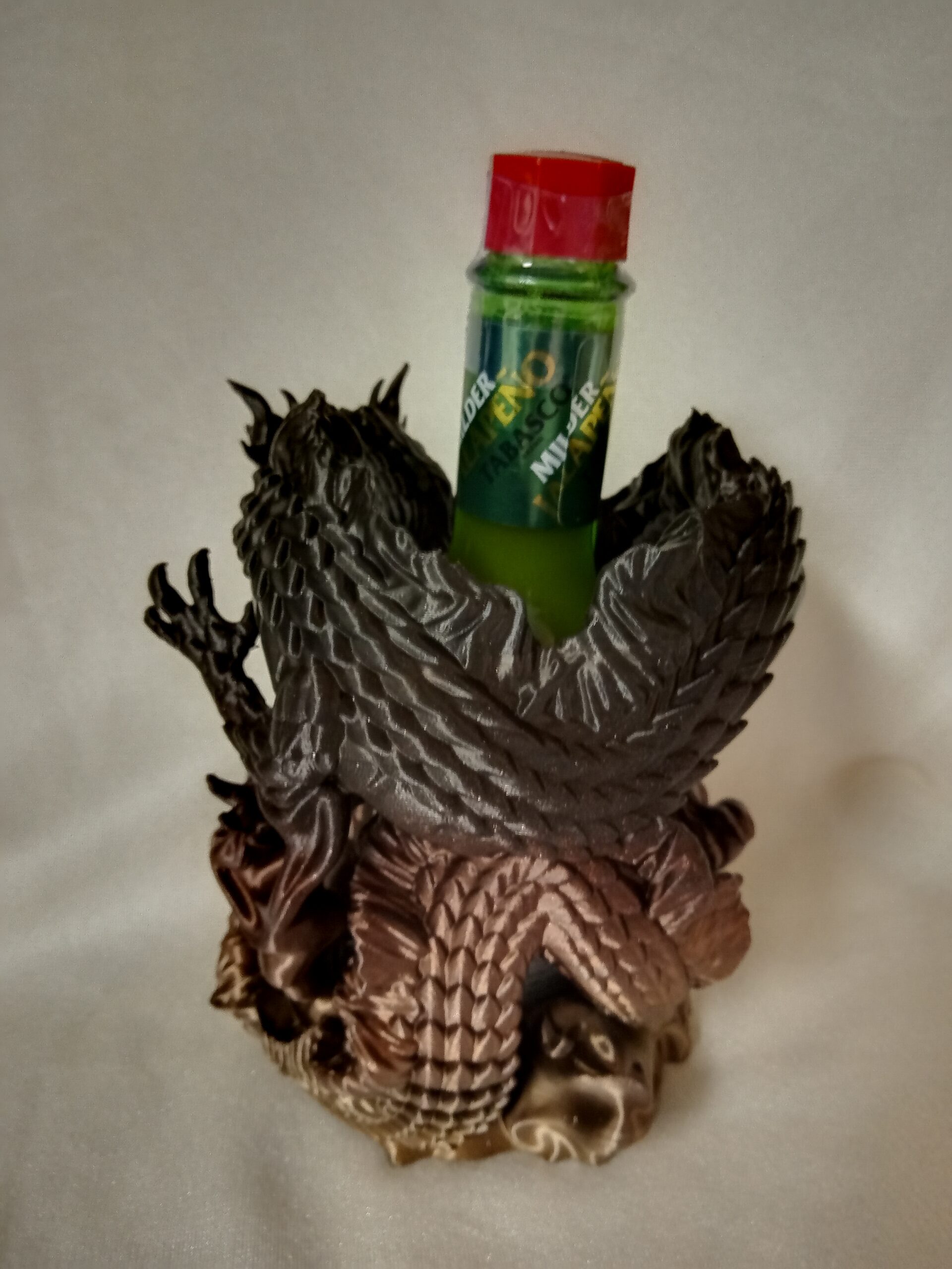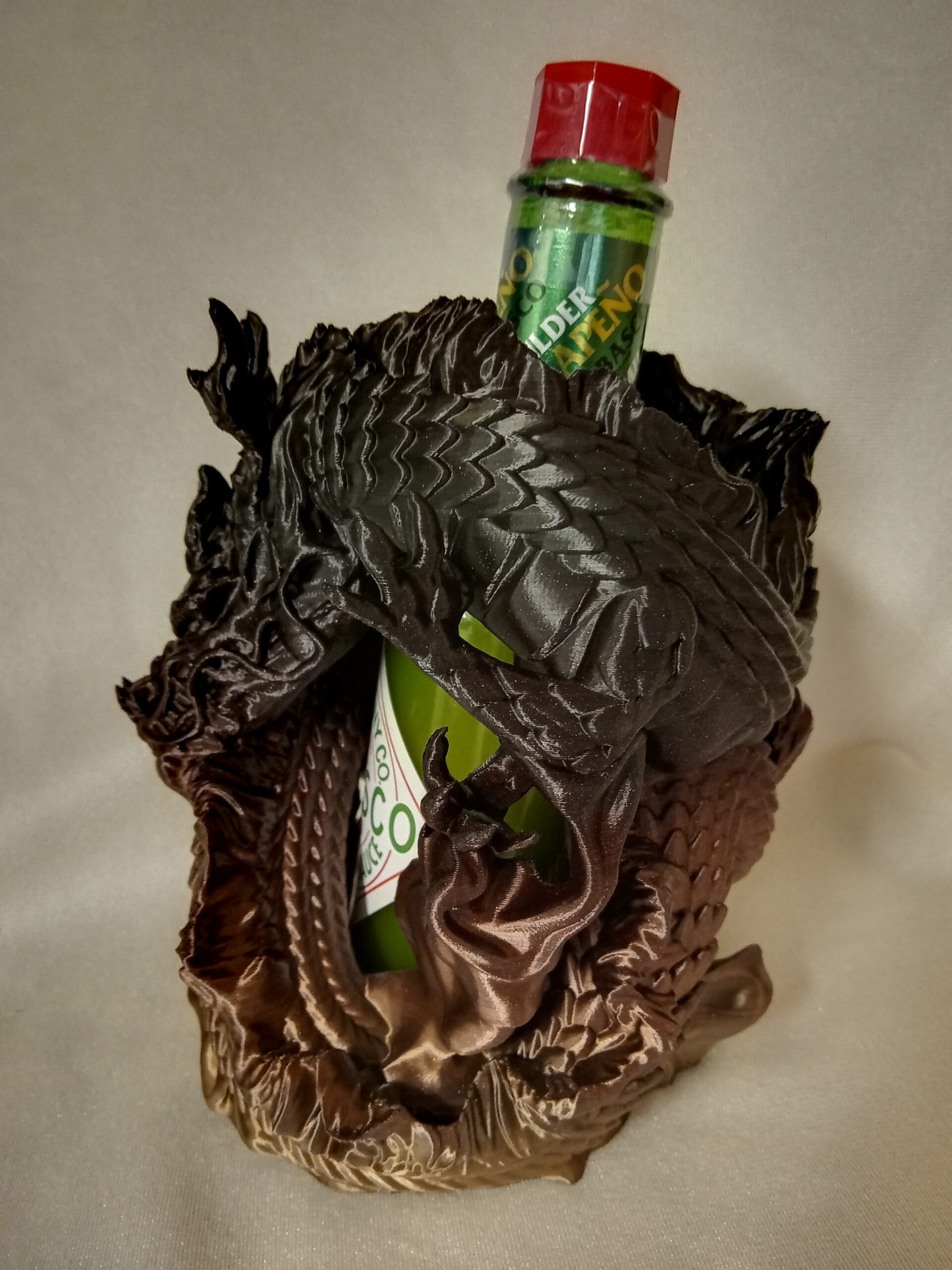 This dragon wraps itself around your 5 oz bottle. Printed in Black/Gold filament. will complement your table