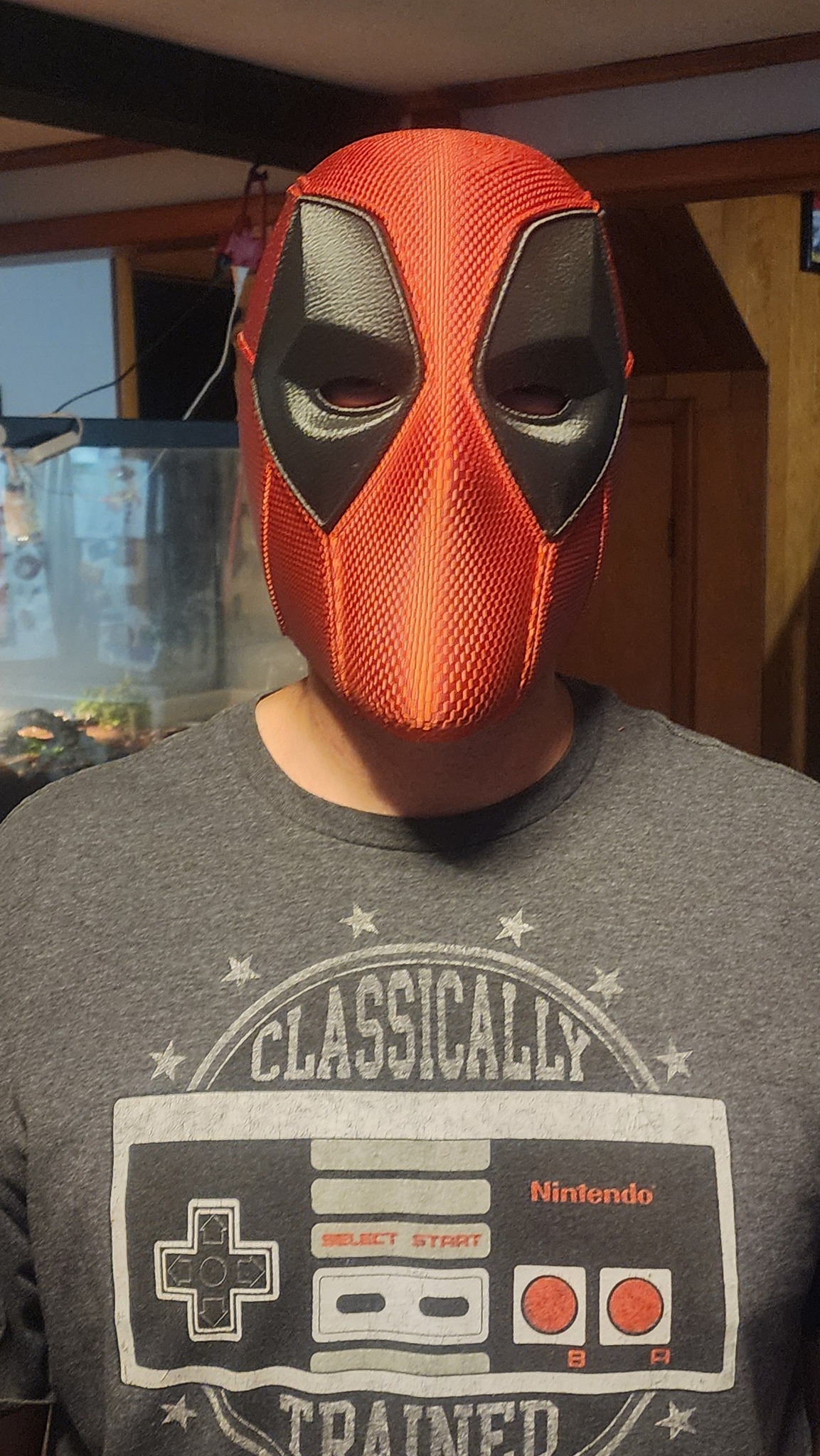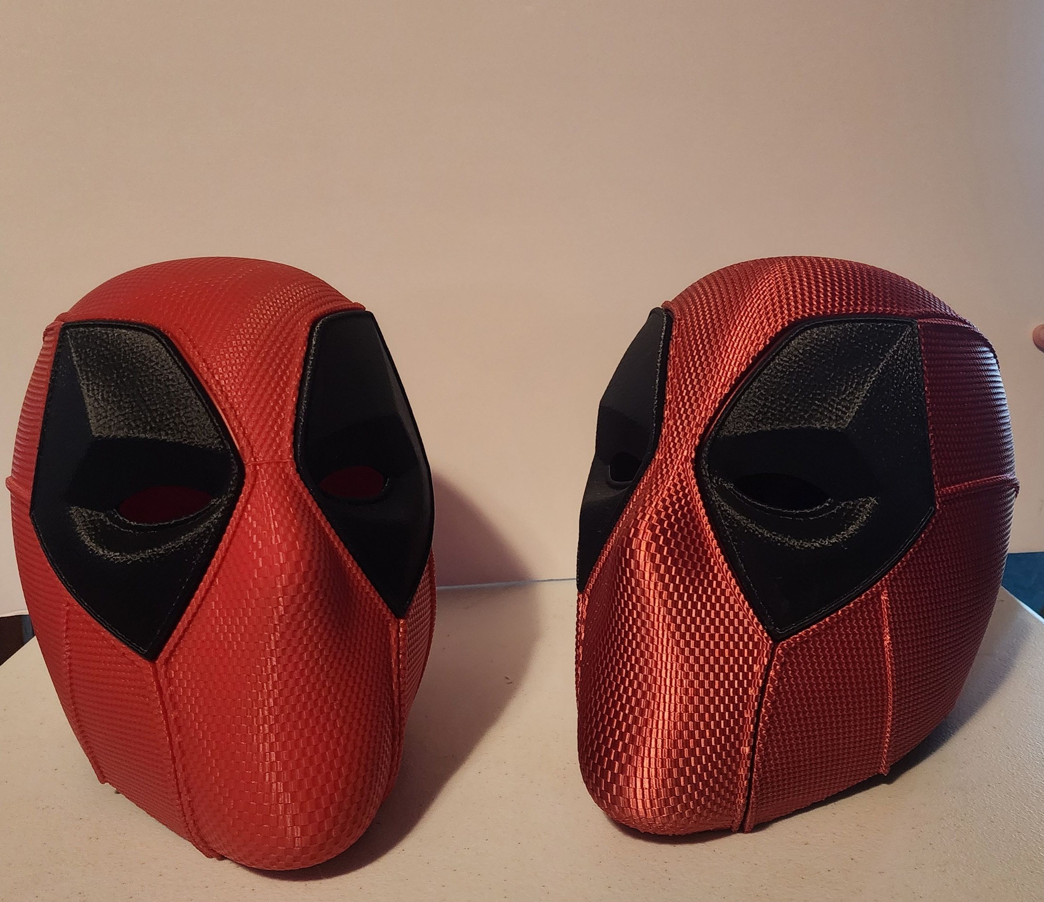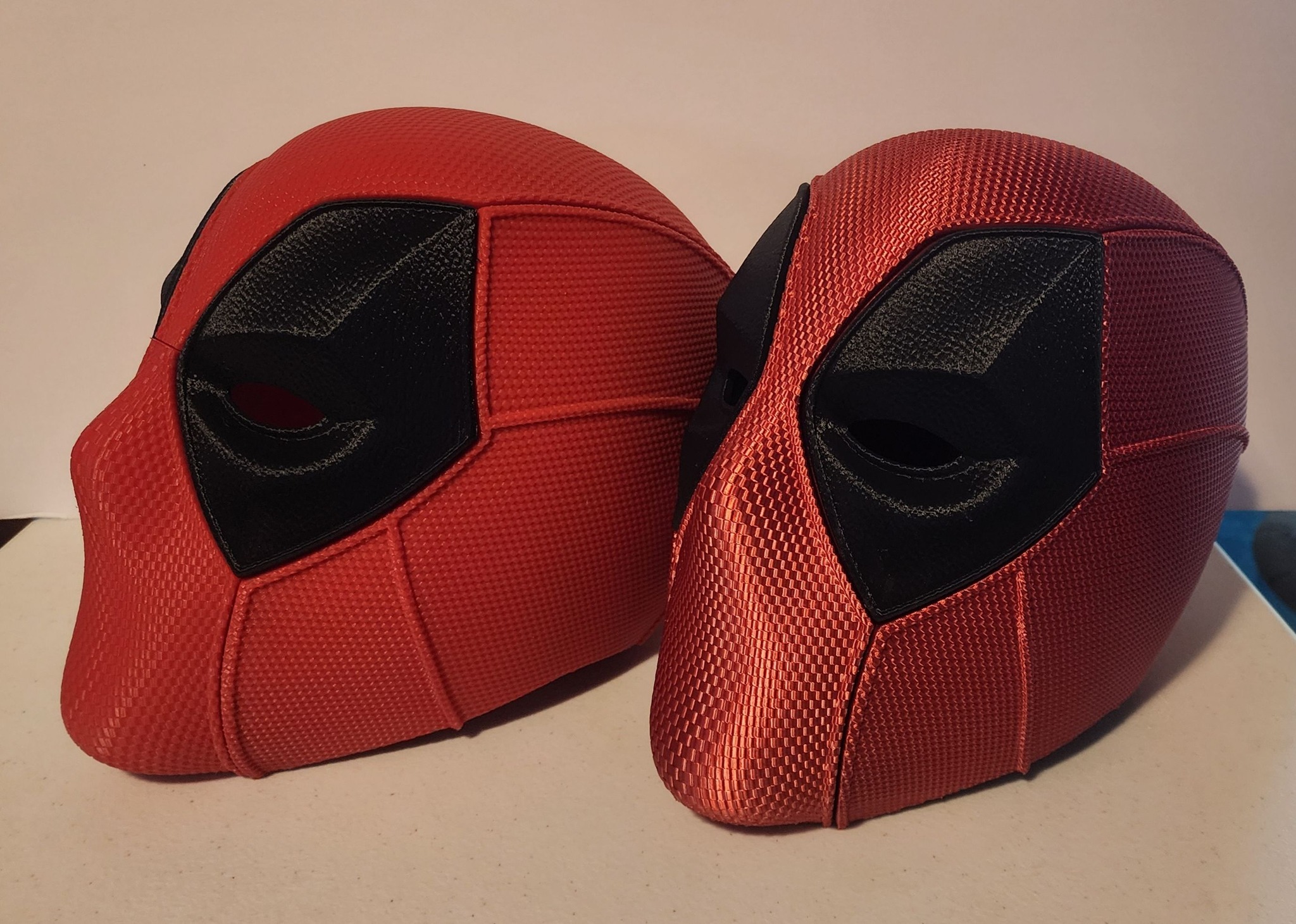 Deadpool helmet, wearable, rough on chin area due to supports during printing, multiple pieces together by magnets, one helmet ($100), one shiny red only, local pick up at Lake of the Ozarks area