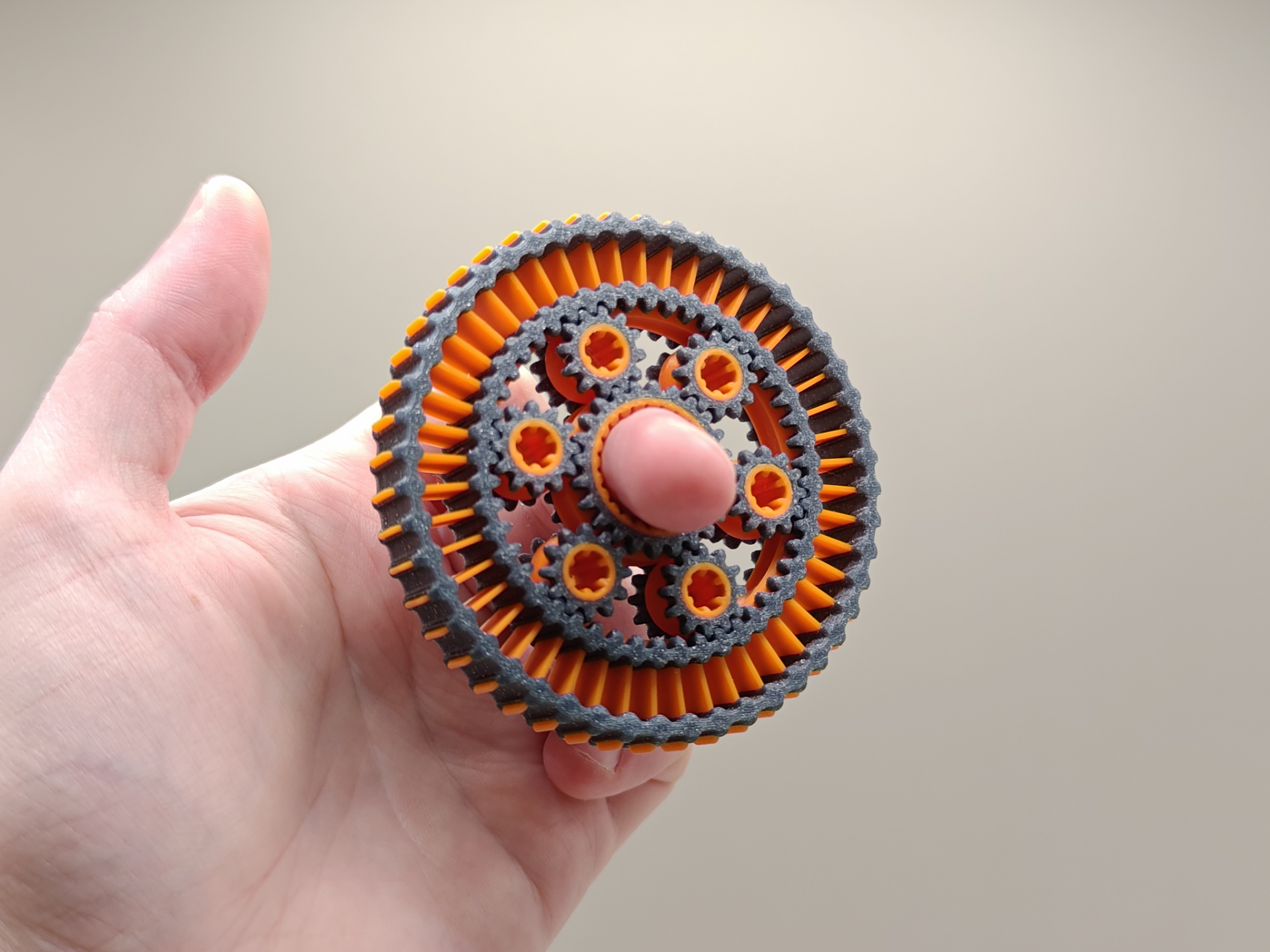 Uma engrenagem planetária de alta resistência em formato de spinner antiestresse. Conta com  6 engrenagens circulares.