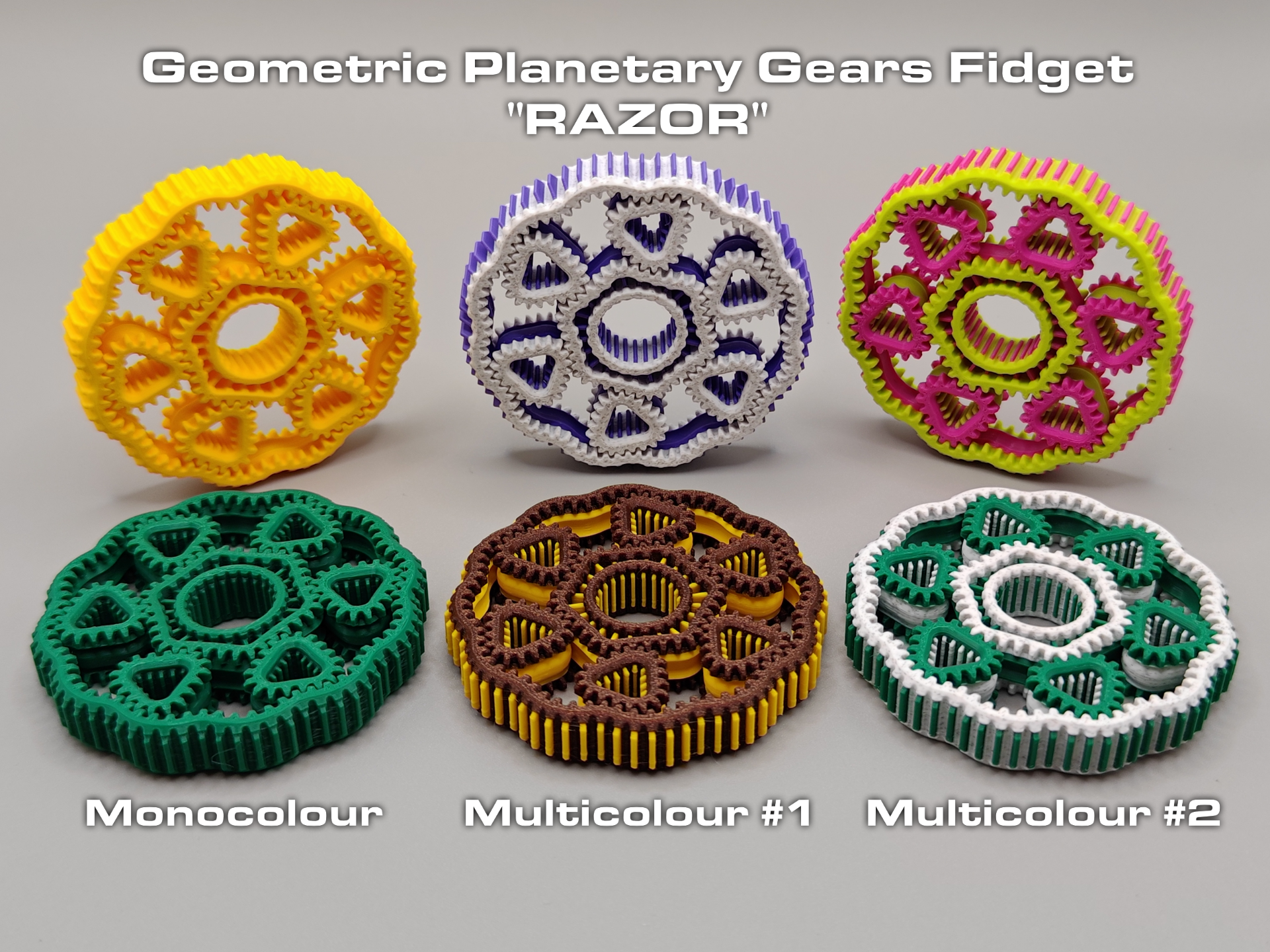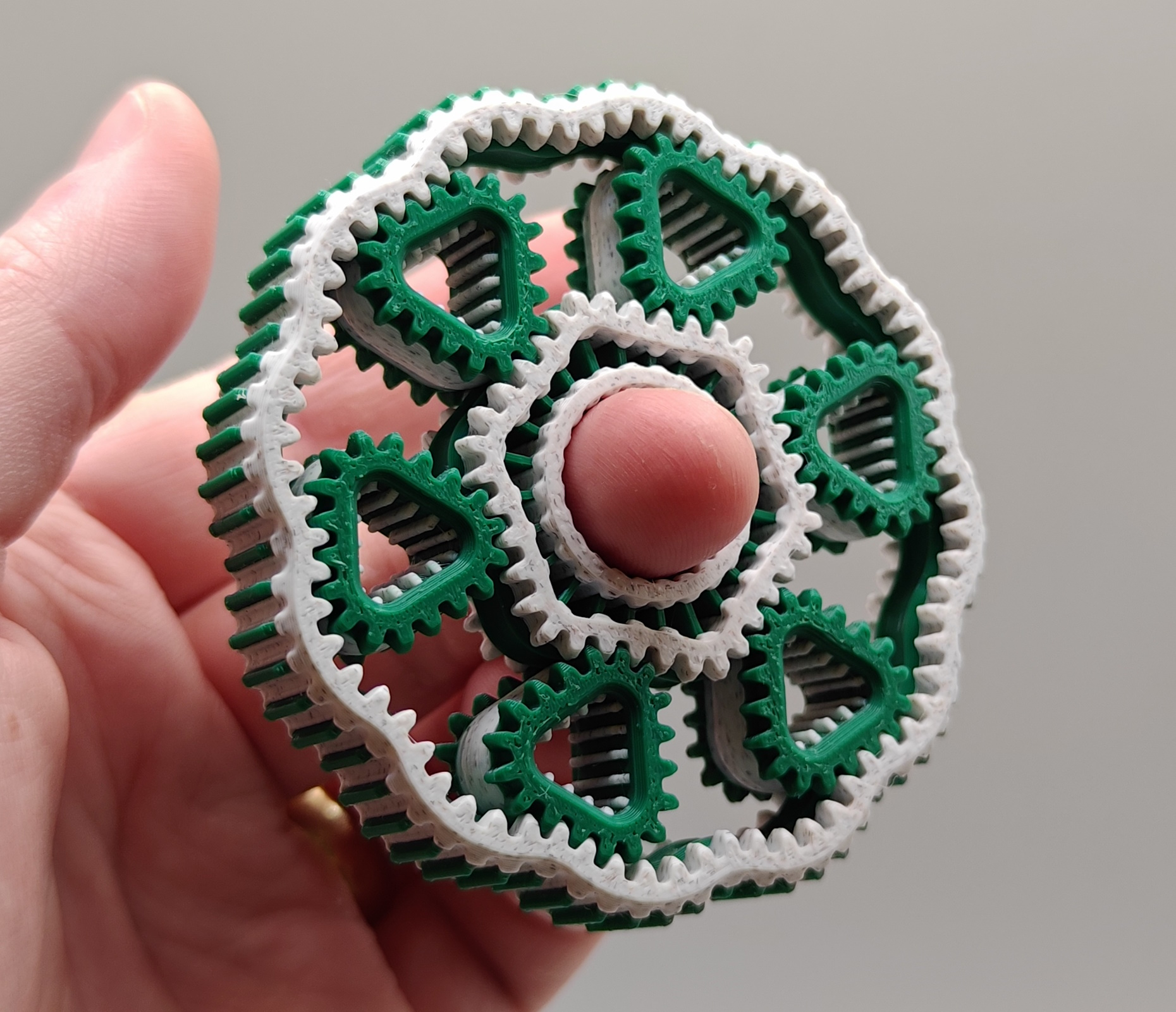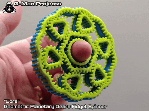 Uma engrenagem planetária geométrica em formato de spinner antiestresse. Conta com 6 engrenagens em formato de triângulo.