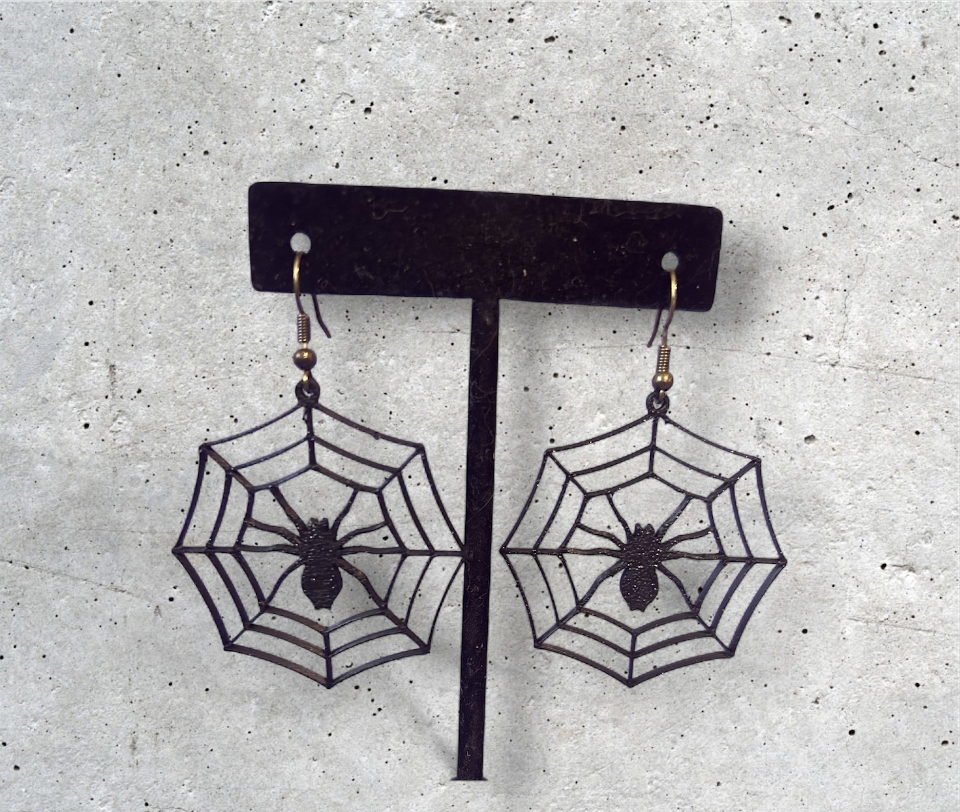 These gothic spider web earrings feature a detailed black metal web with a realistic spider at the center, suspended from gold-colored hooks with bead accents. Lightweight and eye-catching, they’re perfect for Halloween, cosplay, or bold fashion statements.