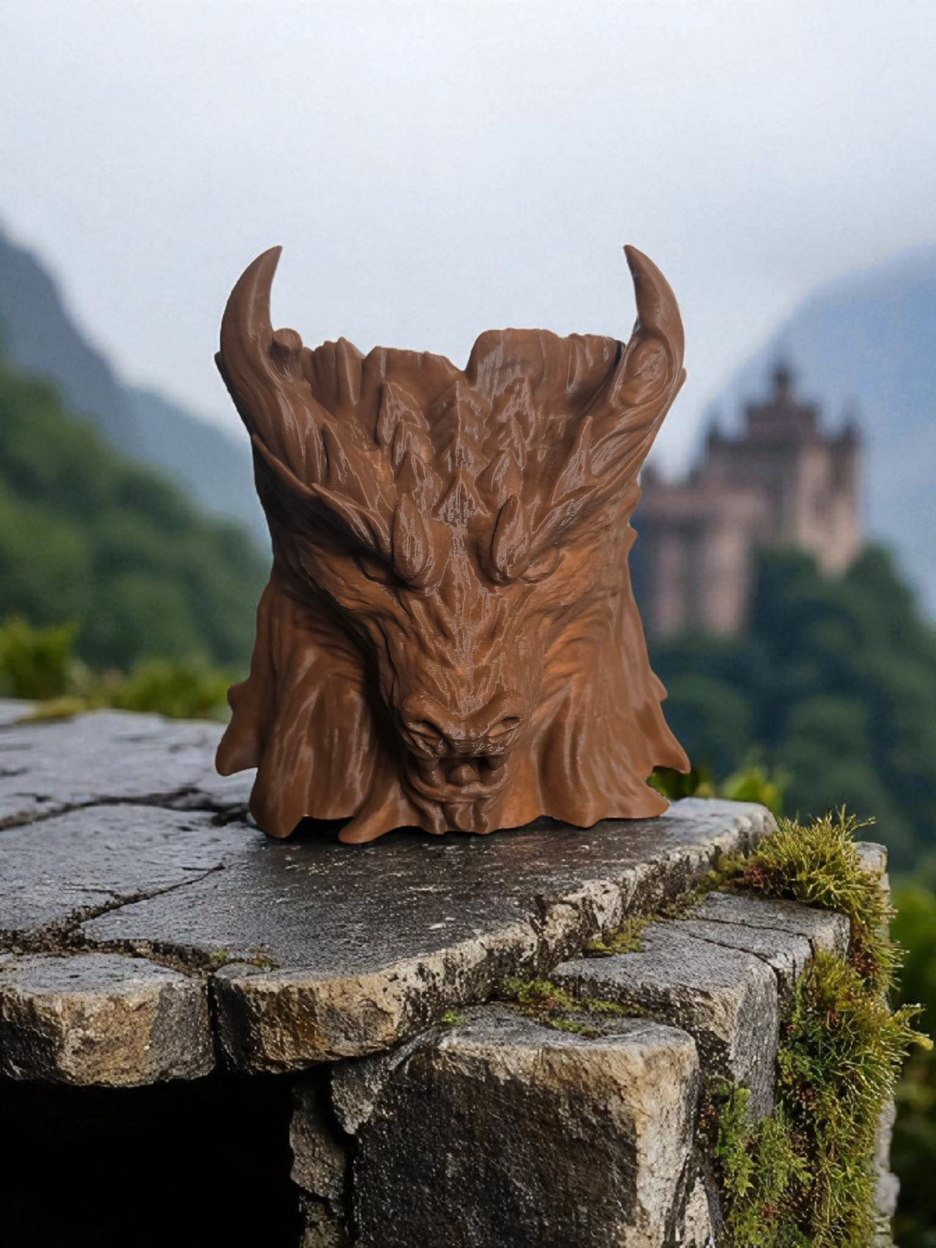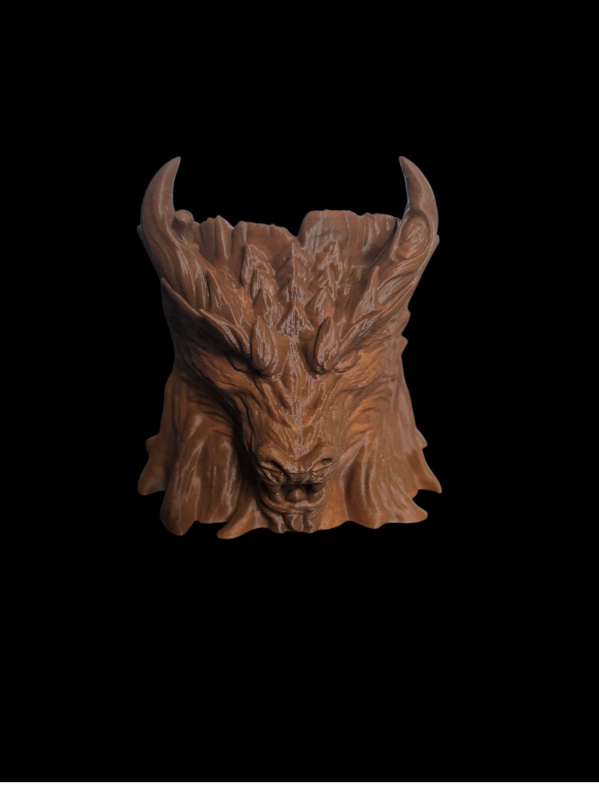 A fierce little guardian sculpted for your shelf, its arched horns and textured scales captured in crisp 3D detail and finished in a rich, warm brown that reads like carved wood.