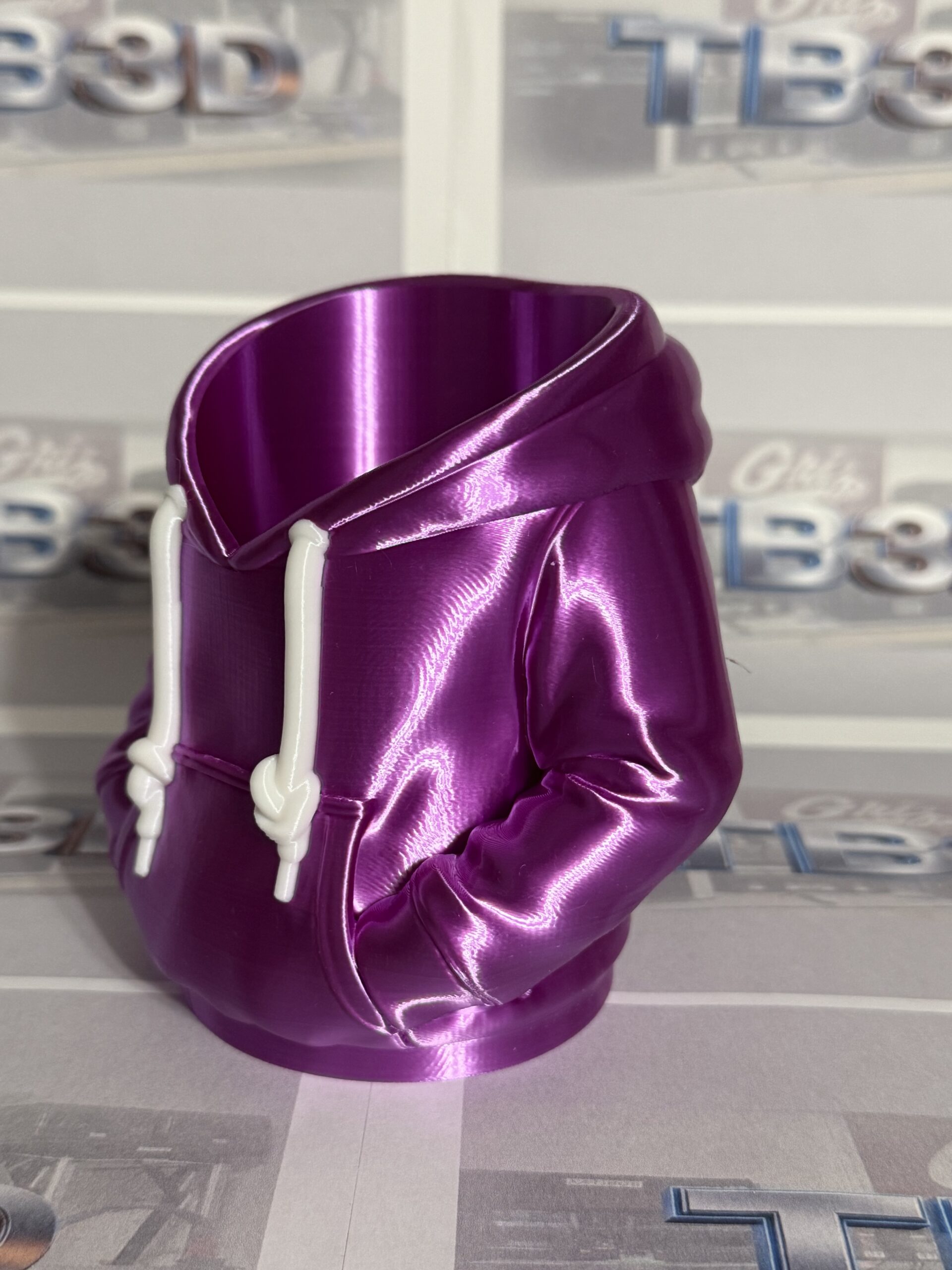 This is a cool looking can koozie in the shape of a nice warm hoodie. Available in a smaller version as a desktop pen/pencil holder.