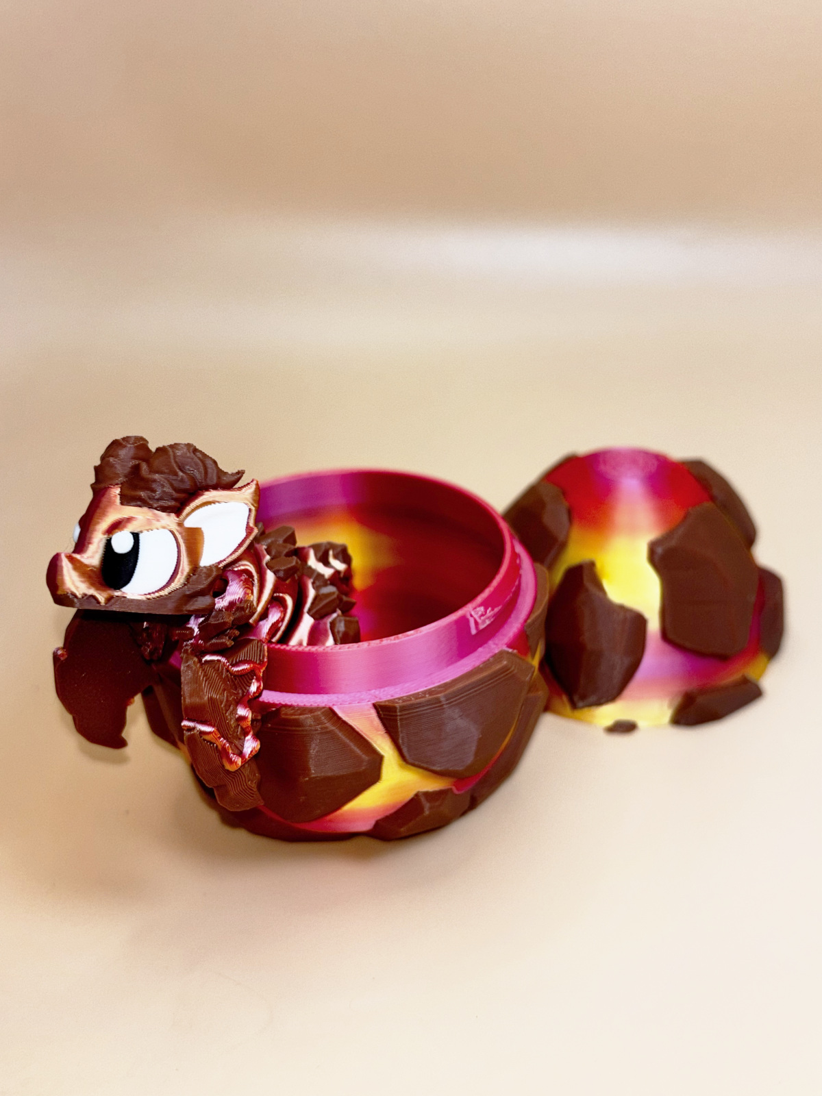 Bring a touch of fantasy to your desk or shelf with this fully articulated mini dragon. Designed with flexible segmented joints, it bends, curls, and poses naturally. Each dragon comes with a matching 3D‑printed egg that opens and closes, perfect for display or imaginative play.