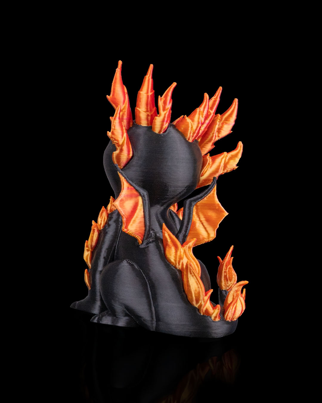 The dragon’s body is textured with subtle scales and defined features, while the flame‑inspired spikes along its head and back reinforce the fire theme. The sculpt balances sharp, dramatic elements with soft curves, making the figure visually striking without feeling aggressive.