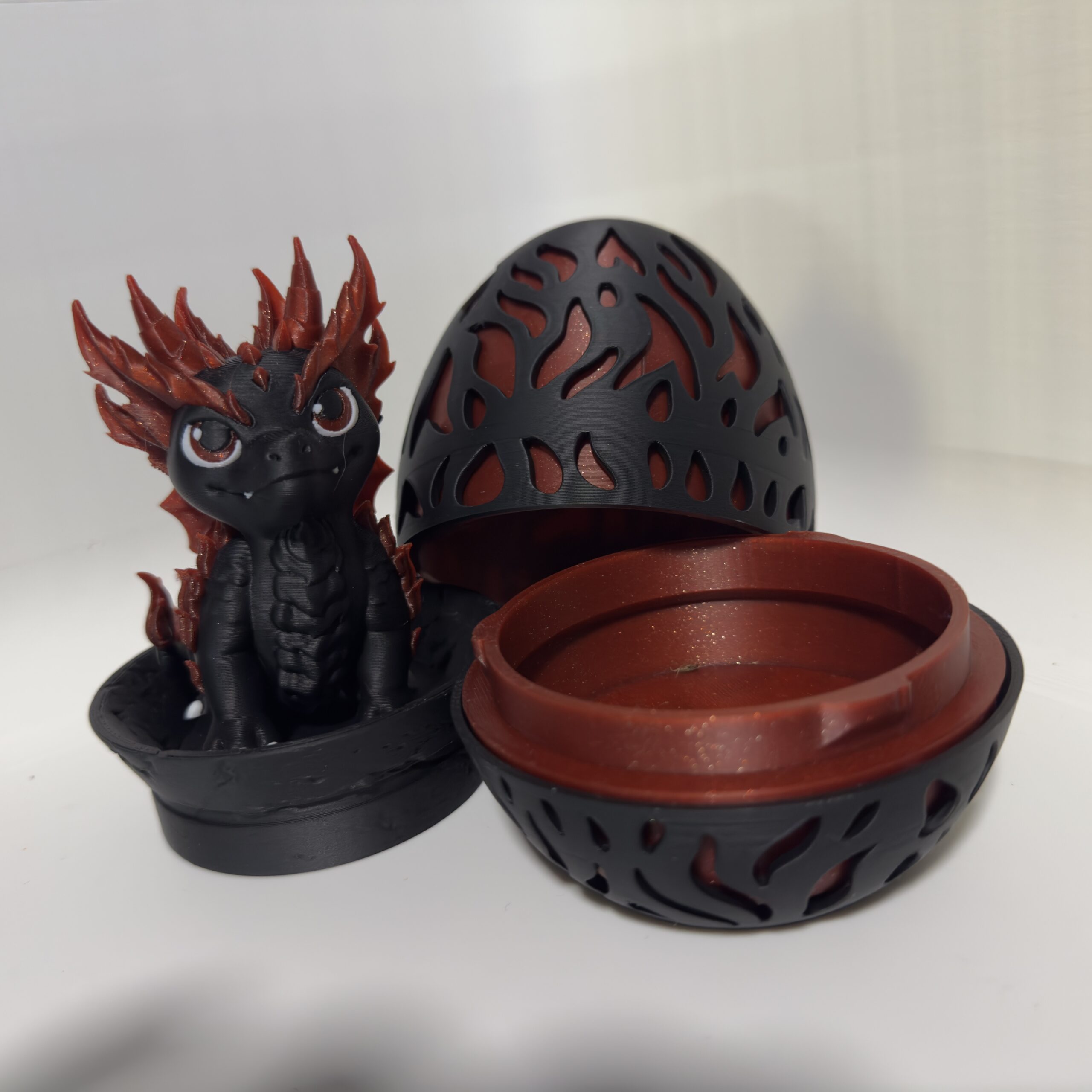 3D printed in durable plastic with contrasting dark and fiery red tones, the set showcases clean layer lines and well‑defined details. The color choices enhance depth and highlight the flame patterns throughout the dragon, egg, and base.