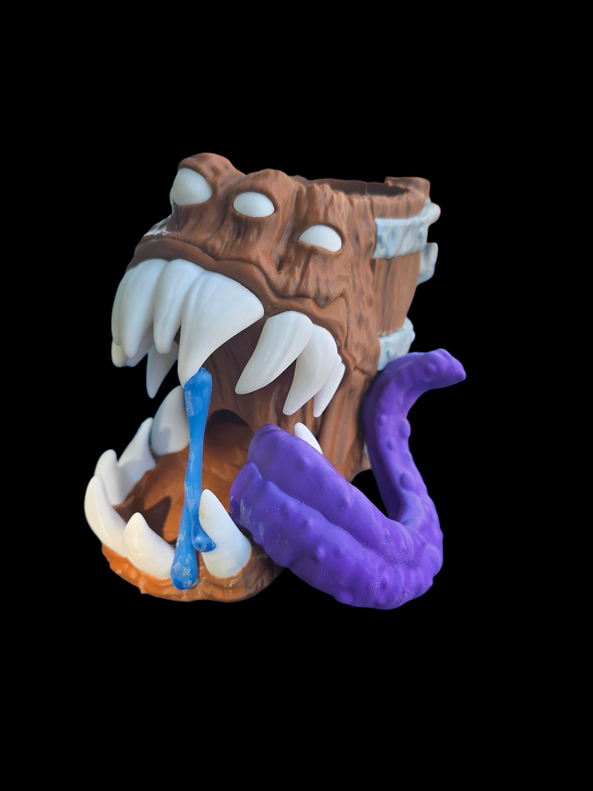 Unleash chaos at your game table with this monstrous multitasker! The Guzzling Grin is no ordinary dice tower—it’s a ravenous mimic disguised as a wooden barrel, ready to devour your dice and your drink. With four bulging eyes, a gaping maw full of jagged teeth, and a mischievous blue tongue, it’s equal parts terrifying and hilarious. A writhing purple tentacle coils from its side, hinting at the creature’s true nature: a cursed creation from the depths of your dungeon crawl.
