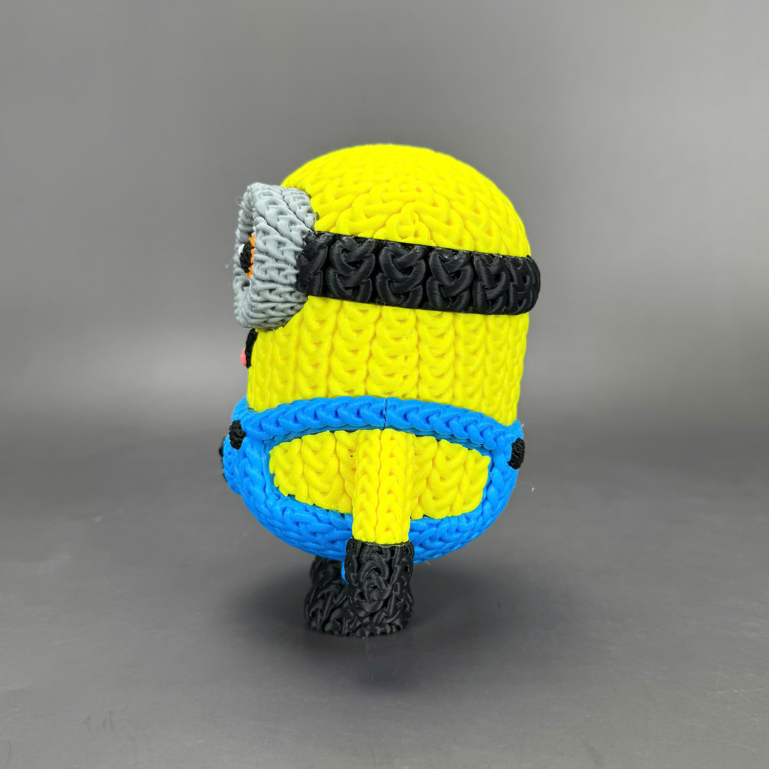 Figura decorativa impresa en 3D con un acabado que imita un tejido trenzado, lo que le da un aspecto original, divertido y muy vistoso. Su diseño colorido y detallado la convierte en una pieza ideal para estanterías, escritorios o como decoración en habitaciones infantiles.
