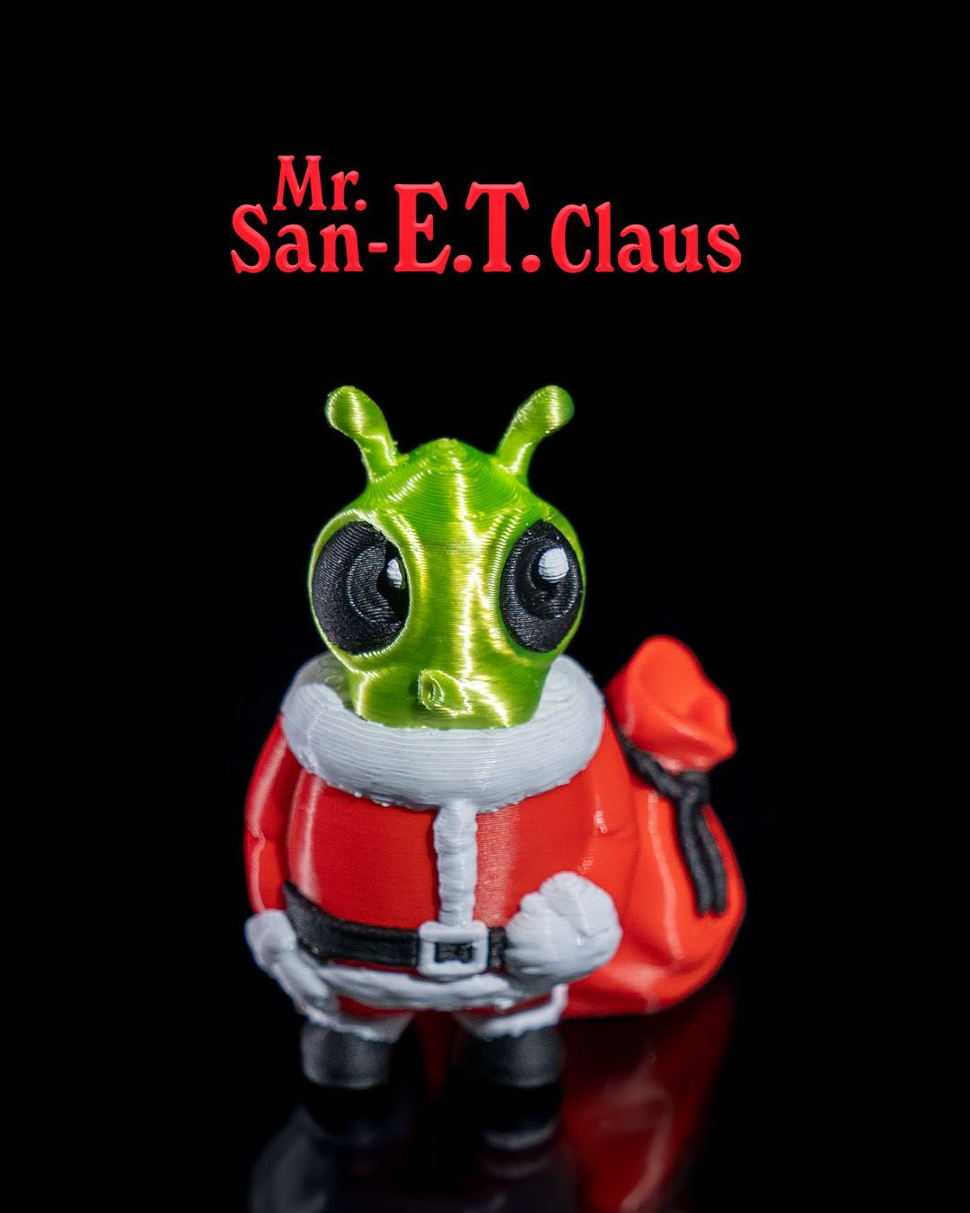 The image shows a small figurine of an alien character dressed as Santa Claus. The alien has a green head with large black eyes and antennae and is wearing a red Santa suit with white trim and a black belt. The character is also holding a red sack, presumably filled with gifts. Above the figurine, the text “Mr. San-E.T. Claus” is written in red letters. The background is black, making the figure and text stand out prominently.