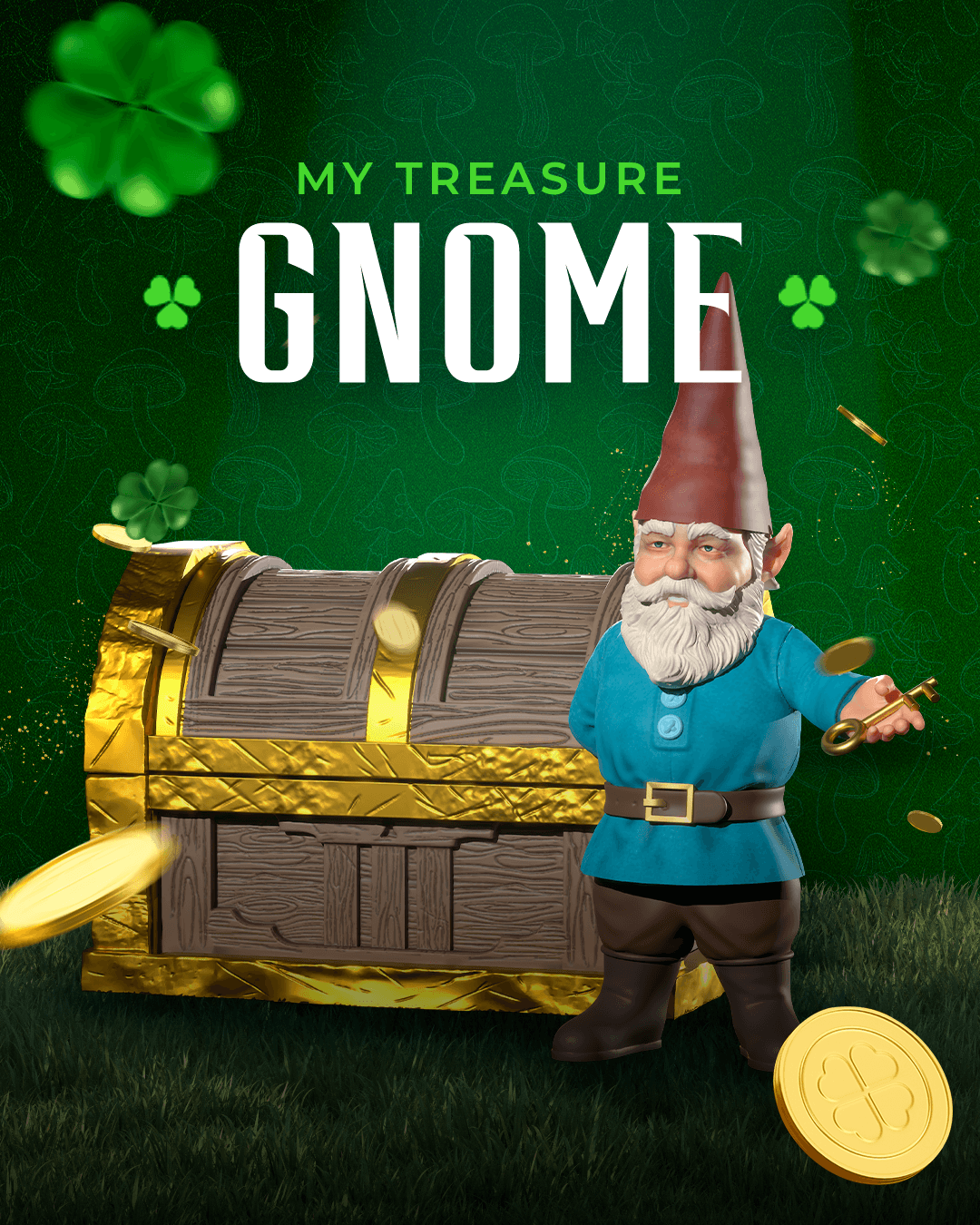 Unlock whimsy and wealth with the My Treasure Gnome—a pint-sized protector of gold and good vibes! This charming garden guardian clutches a golden key and stands proudly beside his overflowing treasure chest, surrounded by floating coins and fields of festive shamrocks. With bold lettering and rich colors, it’s a playful nod to luck, mischief, and mythical fortunes.
