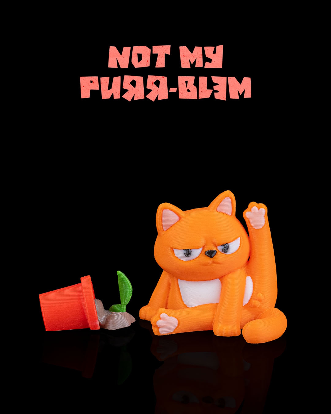 Transforme qualquer ambiente com um toque de irreverência e charme felino! Este enfeite exclusivo, feito por impressão 3D de alta qualidade, apresenta um gato travesso em pose descontraída ao lado de um vasinho derrubado — acompanhado da frase espirituosa “Not My Purr-blem”.