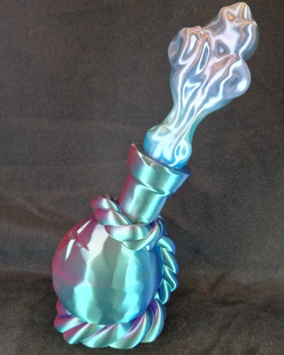 Ce modèle est imprimé avec un filament tricolore bleu, vert et violet pour la potion, la fumée est imprimé avec un filament avec un dégradé de bleu.