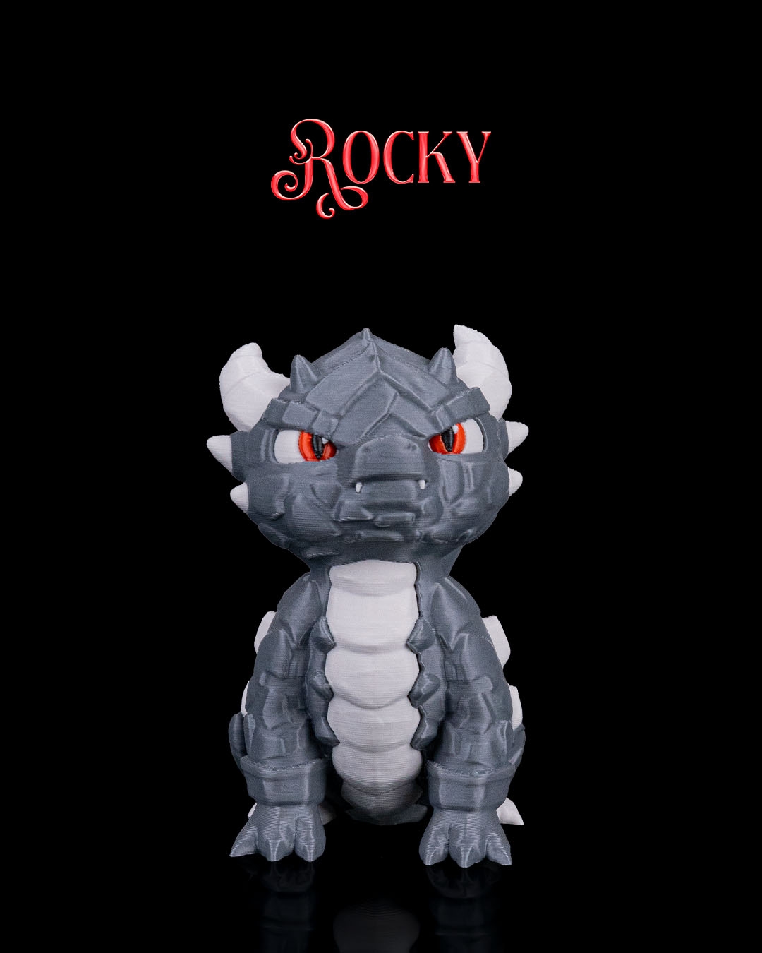 - The baby dragon is sculpted with a solid, stone‑like appearance, featuring layered, rock‑plate textures across its body.
