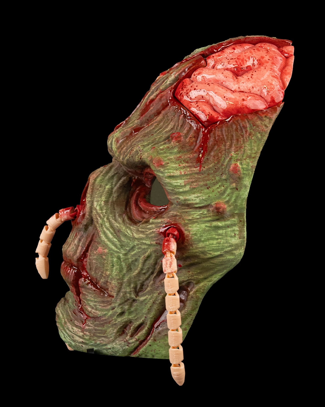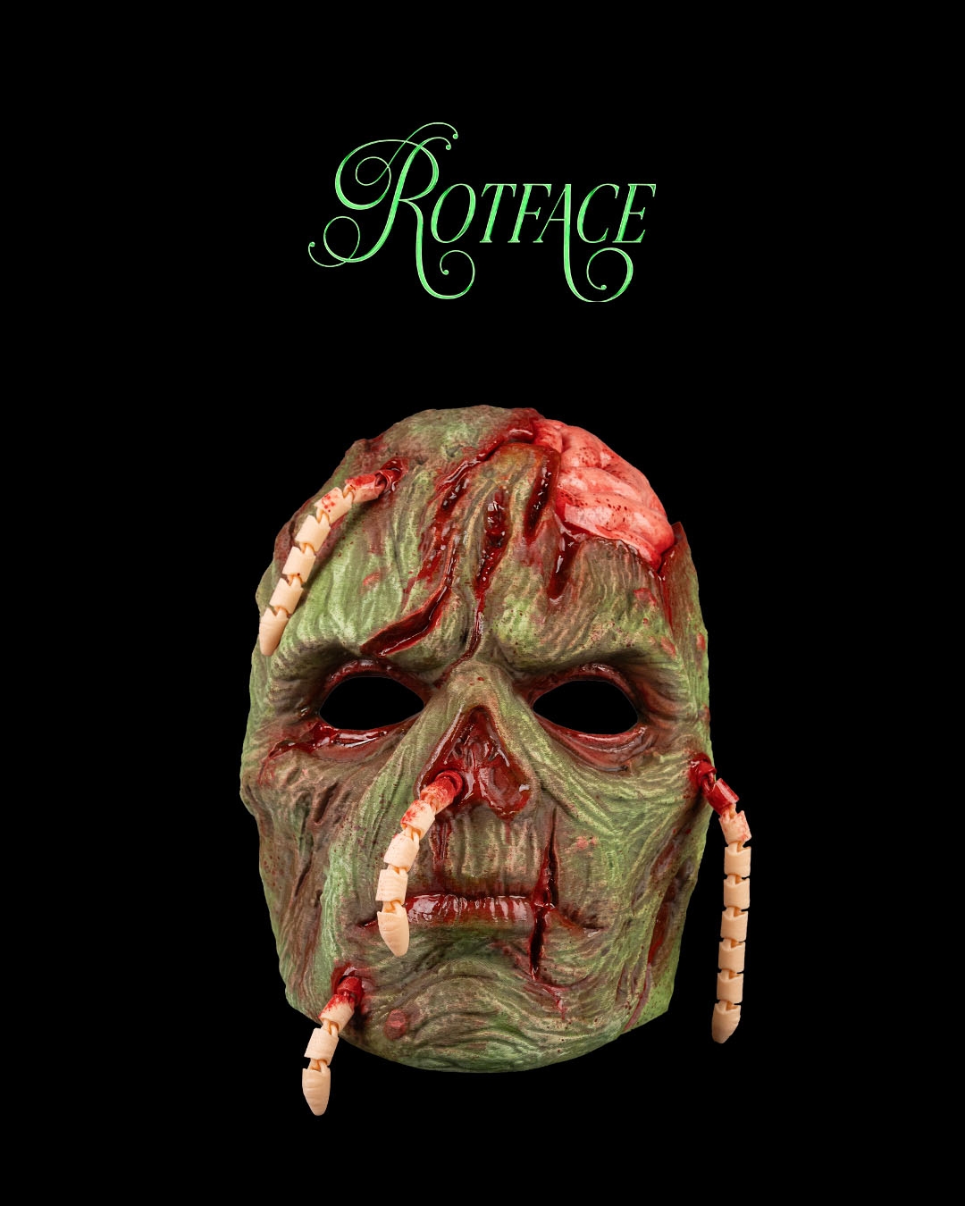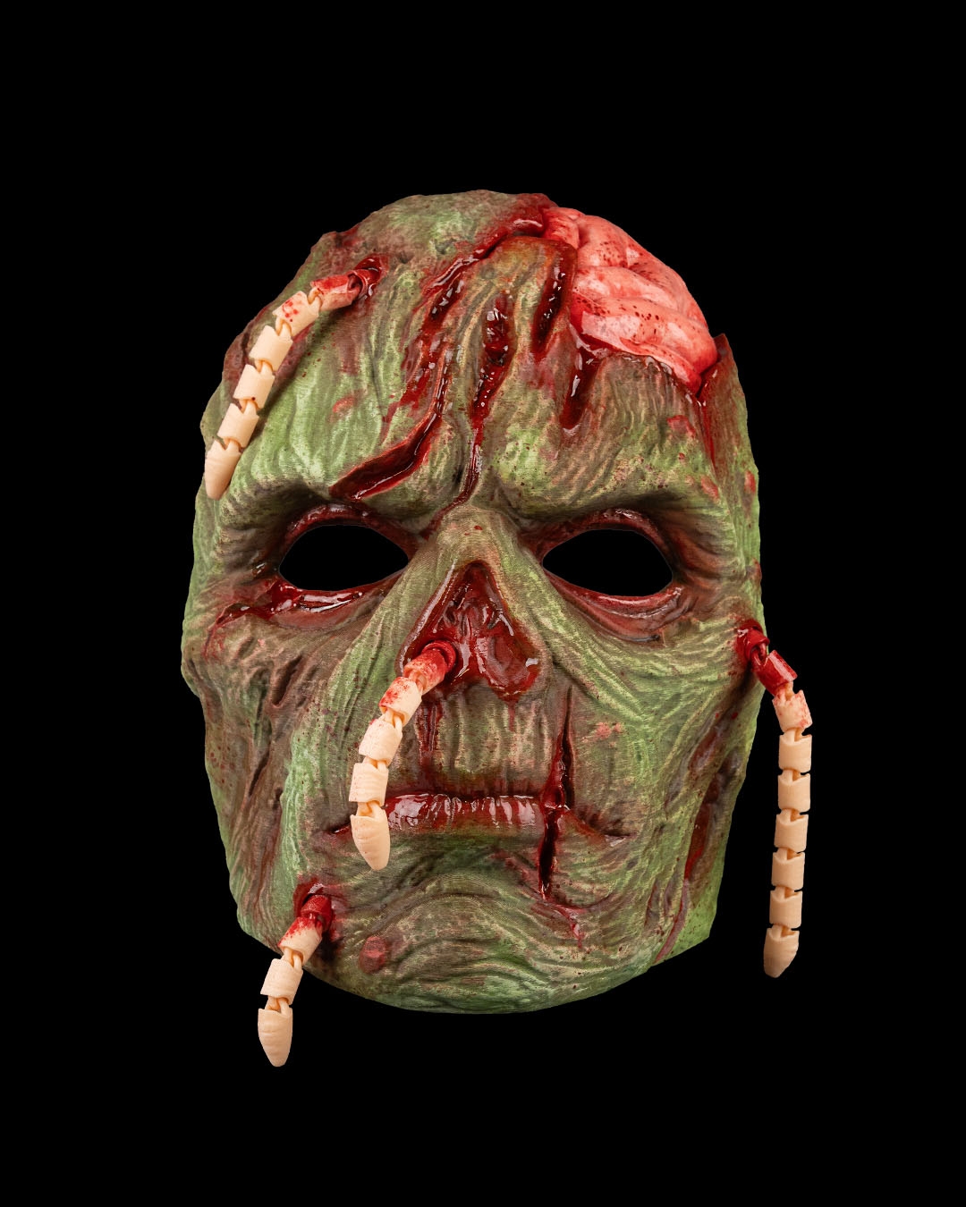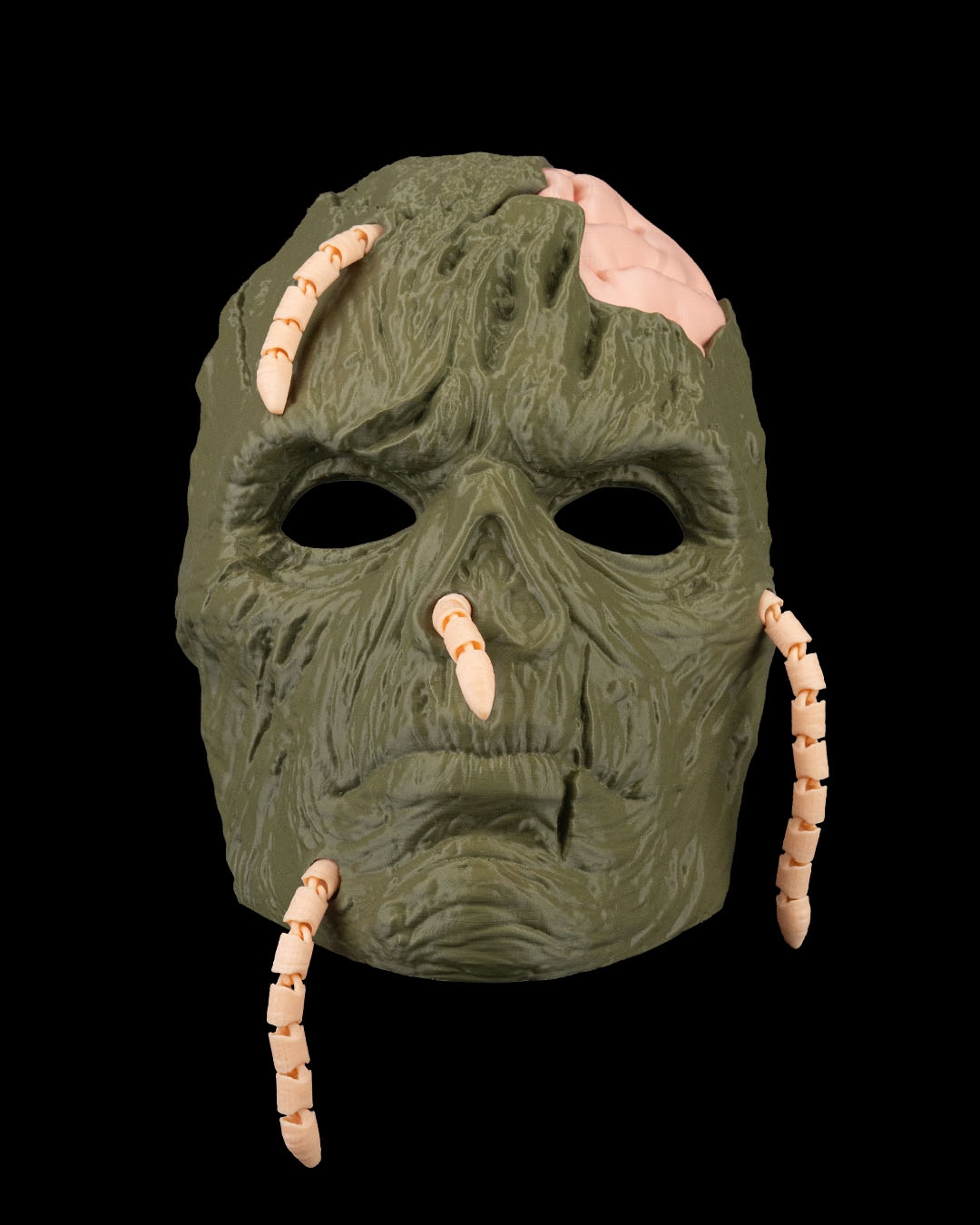 A decaying visage crawling with maggots, where death refuses to stay buried.