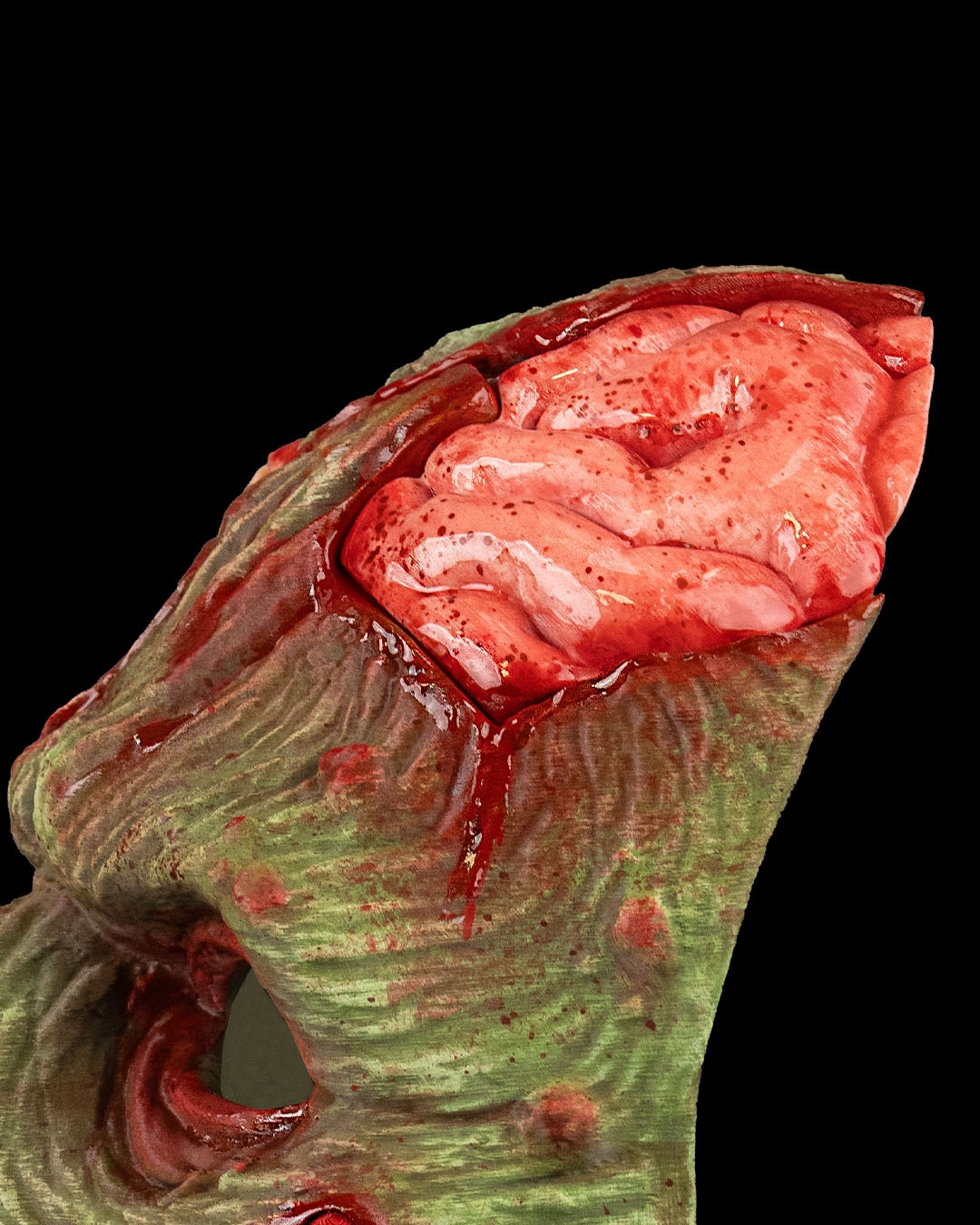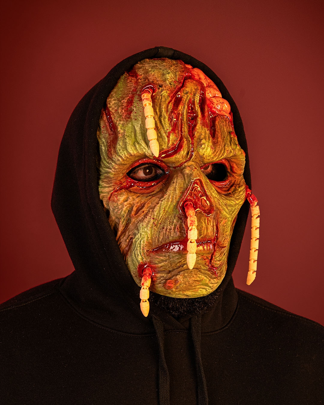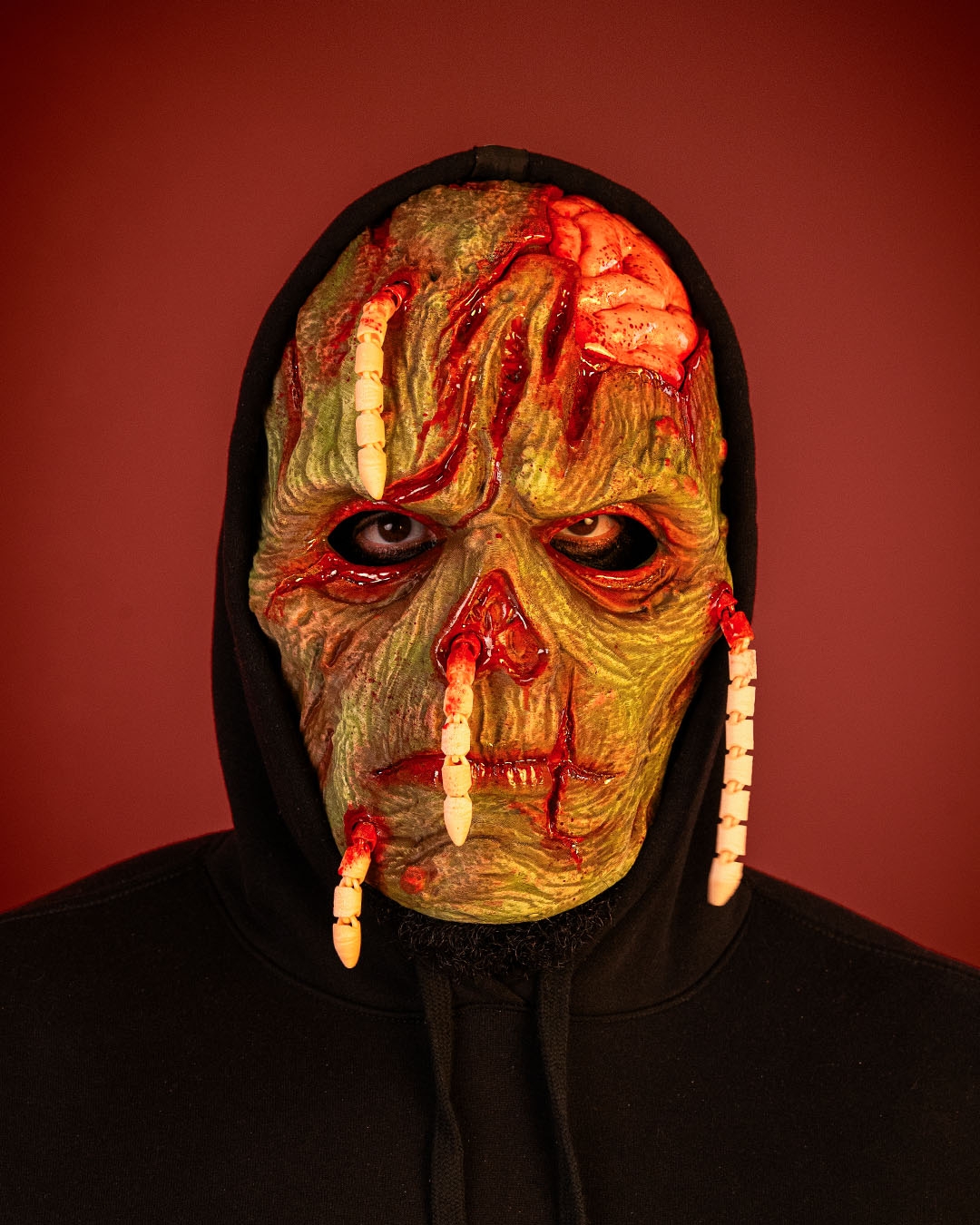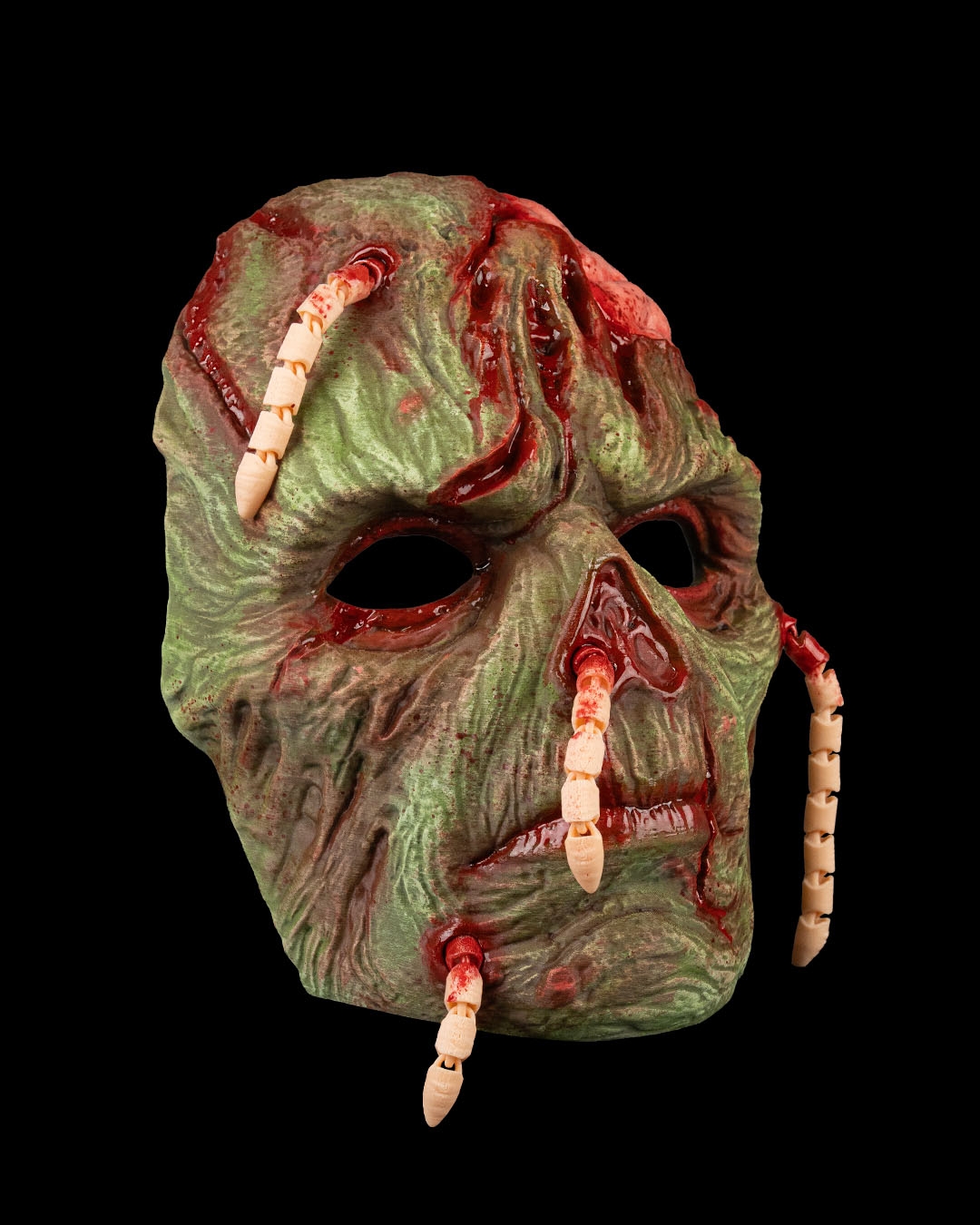 A decaying visage crawling with maggots, where death refuses to stay buried.
