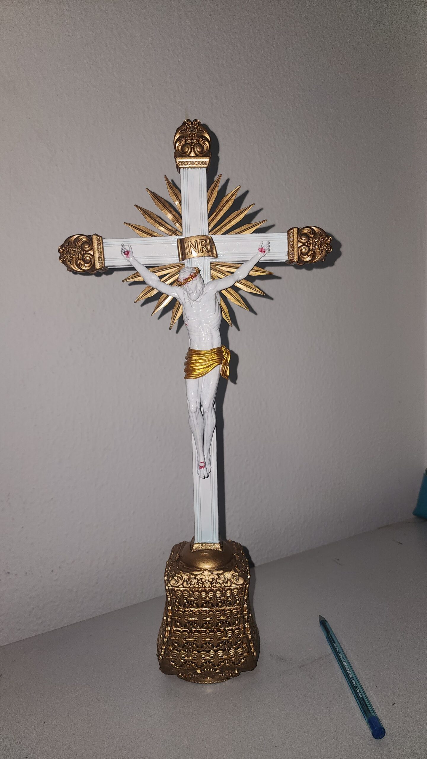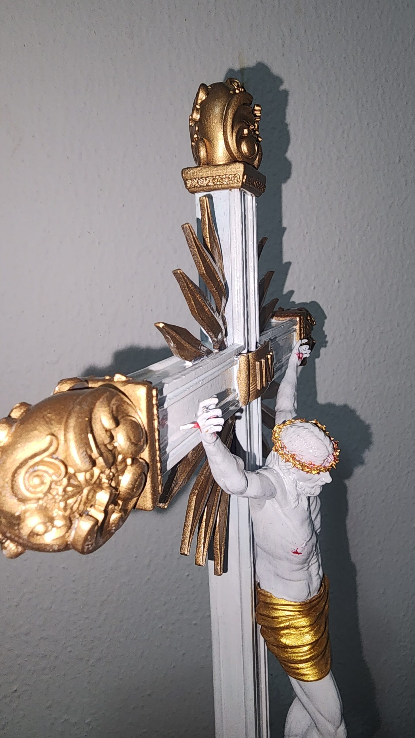 A base é impressa em filamento com madeira e a peça é pintada à mão em branco e dourado, com detalhes em vermelho sangue que realçam a expressão e o sacrifício de Jesus. Cada detalhe foi cuidadosamente trabalhado para proporcionar uma aparência realista e impactante.